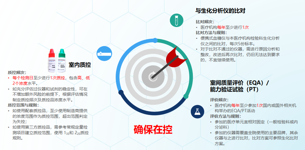 (三)明確質控要求,從室內質控,與生化分析儀的比對,室間質量評價(EQA)/能力驗證試驗等方面做出了詳細規(guī)定;如在室內質控頻次上,要求每個檢測日至少進行1次質控,包含高、低2個濃度水平,這些細則的出臺能夠幫助院內POCT最大化“確保在控”。