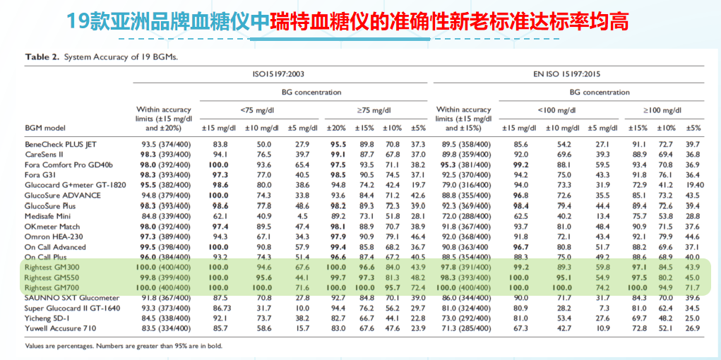 作為案例,張主任還列舉了一項由專業(yè)實驗室團隊進行的亞太地區(qū)血糖儀準確度測試實驗。實驗結果顯示,在接受測試的19款亞洲品牌血糖儀中,瑞特血糖儀的準確性的達標率均處于較高水平。