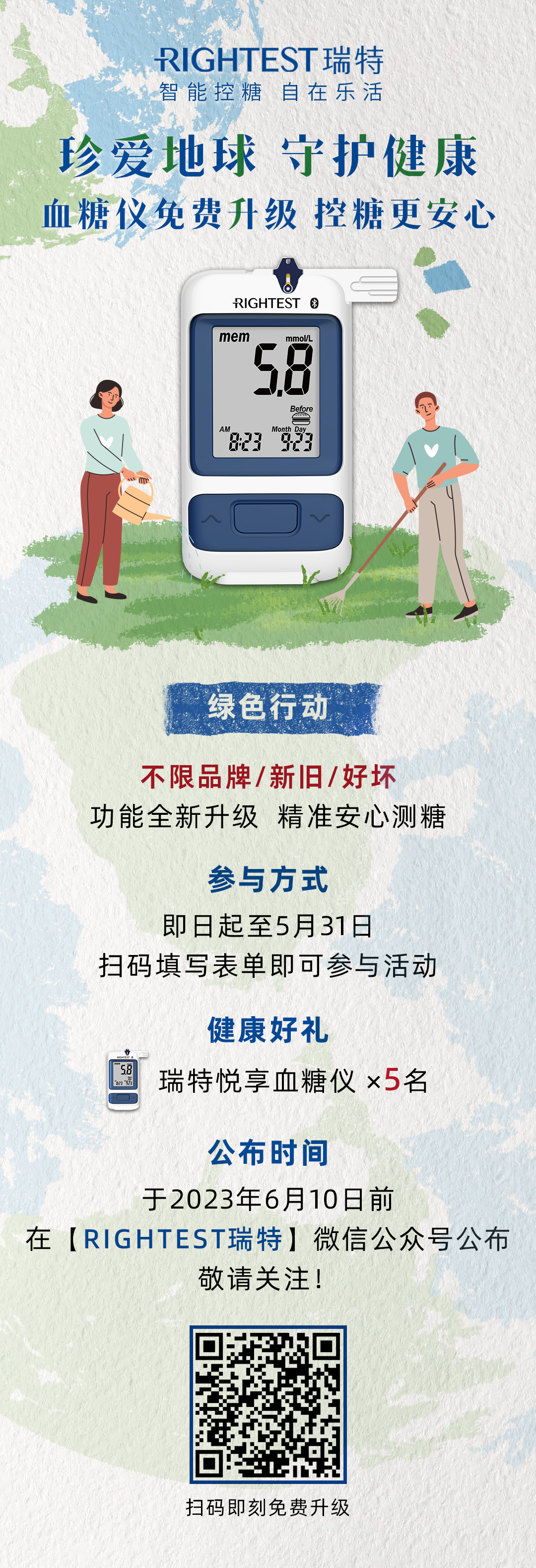 2023年是第54個(gè)世界地球日,為了倡導(dǎo)綠色行動(dòng),RIGHTEST瑞特即日起至5月31日開啟血糖儀免費(fèi)升級(jí)綠色行動(dòng),一起珍愛地球,人與自然和諧共生。