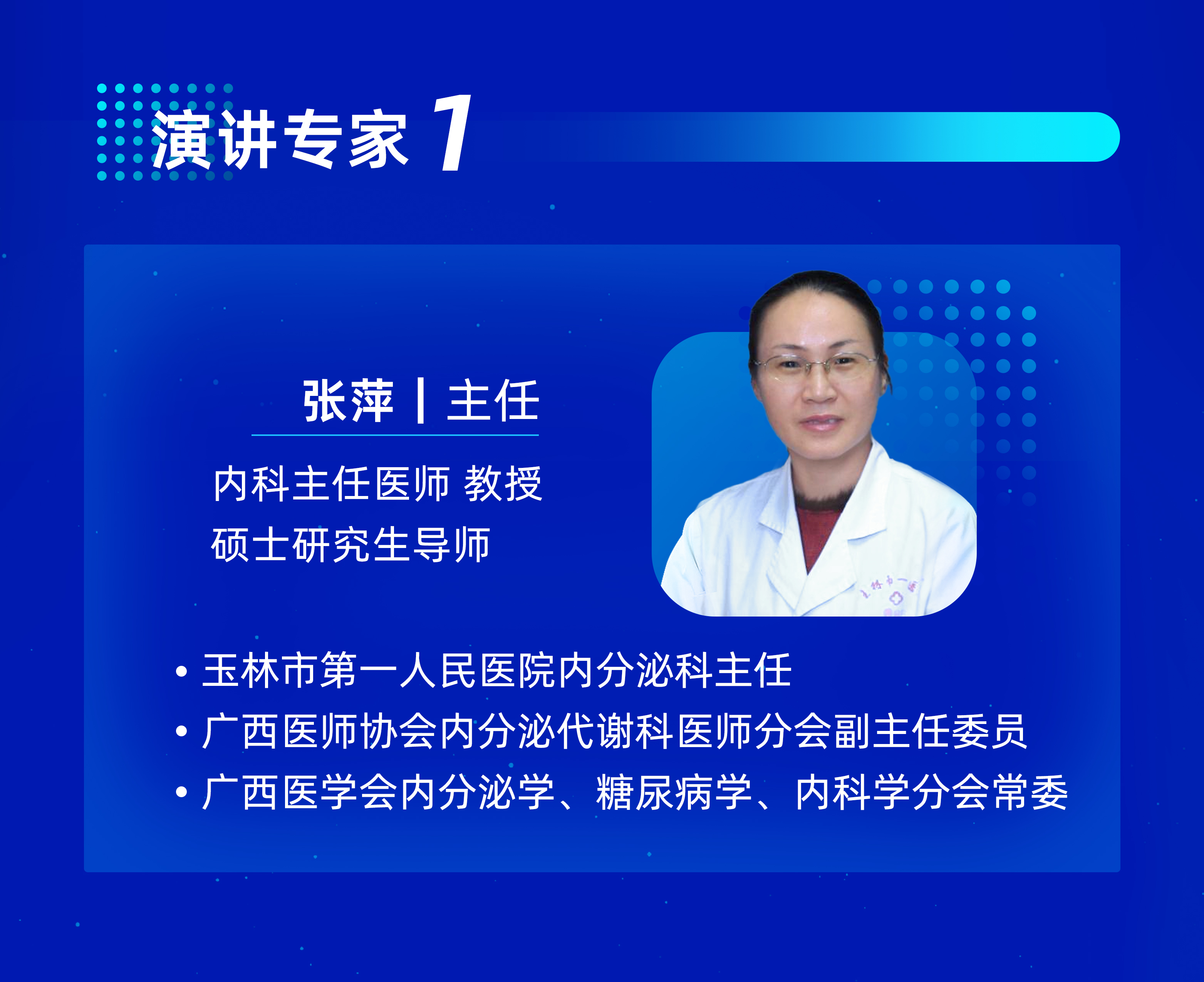 ● 廣西省玉林市第一人民醫院內科主任醫師、教授、研究生導師,同時擔任廣西醫師協會內分泌代謝科醫師分會副主任委員。