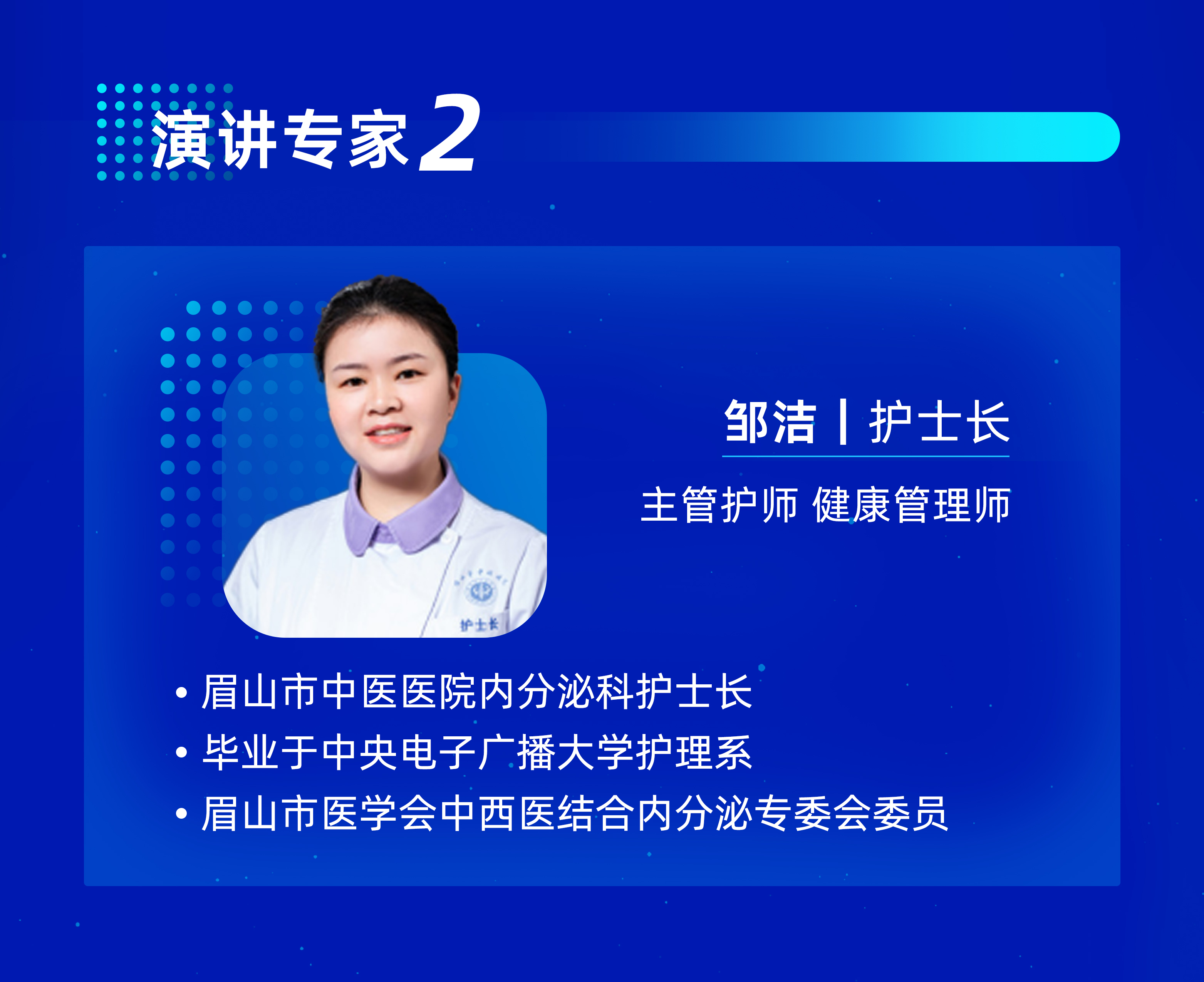 四川省眉山市中醫醫院內分泌護士長、主管護師、健康管理師。