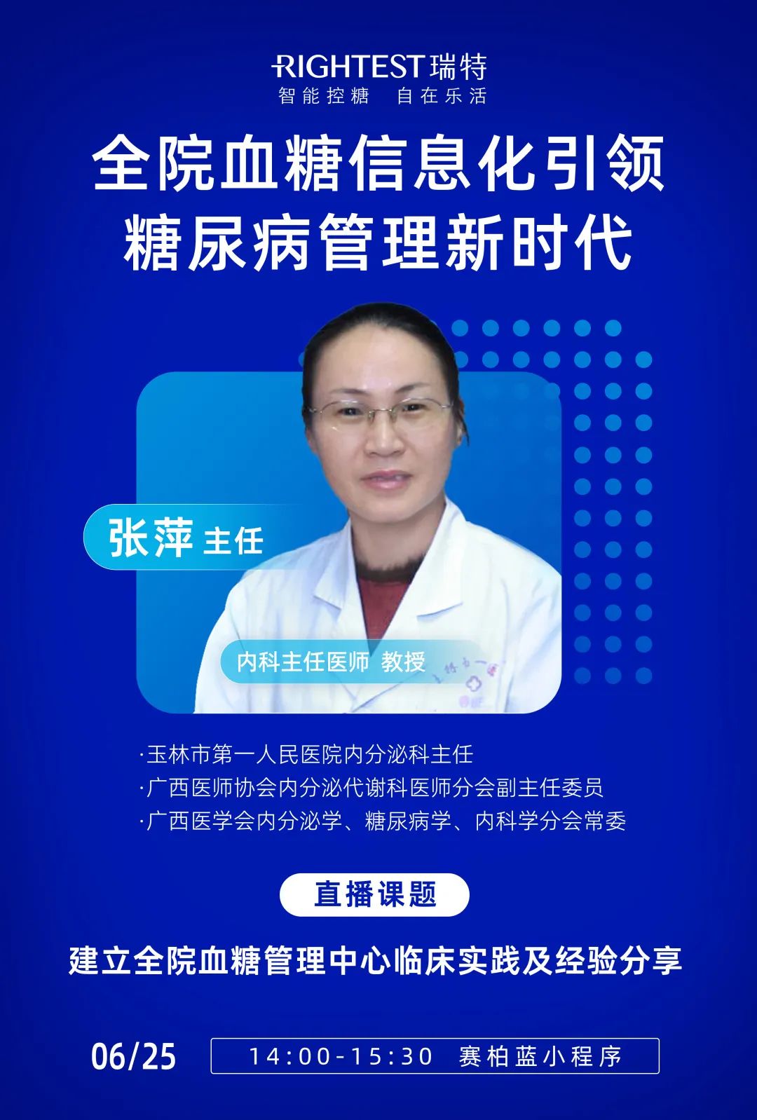 近日,知名血糖管理品牌華廣瑞特攜手資深內分泌專家張萍教授,在線上召開了一場主題為“全院血糖信息化引領糖尿病管理新時代”的學術直播會議。會議中張萍教授以其所在醫院的“玉林經驗”為案例,圍繞建立全院血糖管理中心臨床實踐以及探索規范化、標準化、智能化的血糖管理模式,為大家帶來了精彩的干貨分享,為高質高效高水平的慢病管理提供了可借鑒途徑。