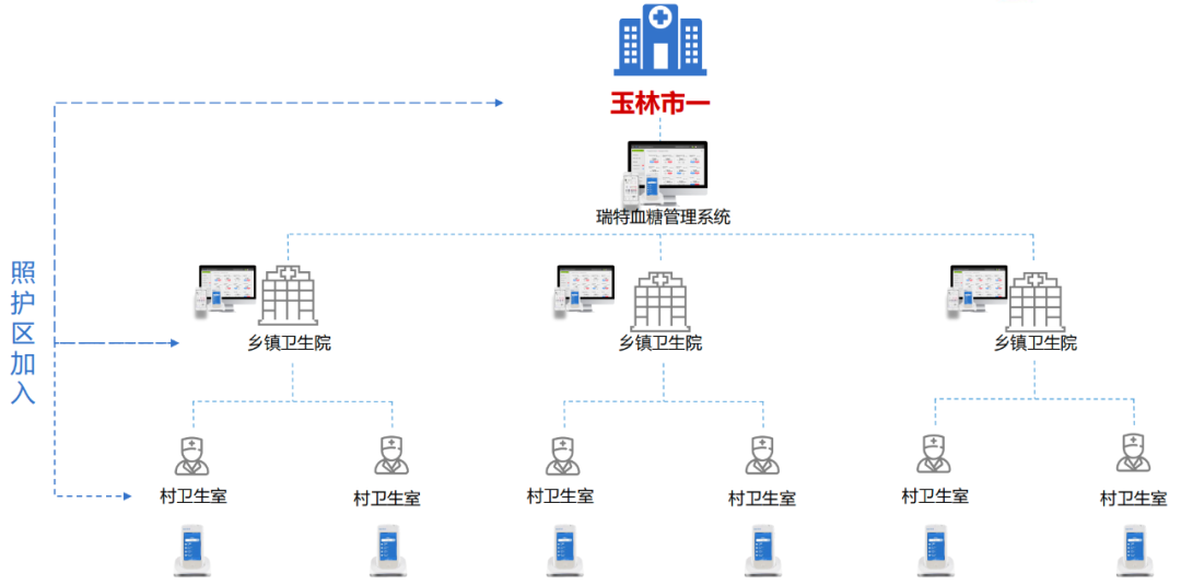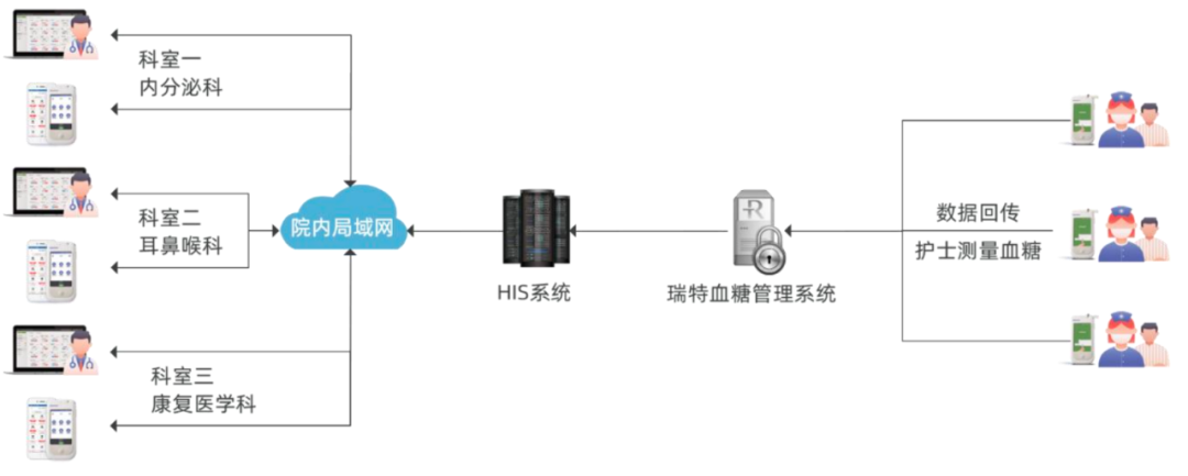 在以內分泌代謝科為主導的全院血糖管理中心架構中,華廣瑞特全院血糖智能管理系統與醫院HIS等院內信息系統單向或雙向信息傳輸,以內分泌科為基礎,聯通全院血糖數據,打破全院47個科室間血糖數據信息孤島,實現血糖監測規范化的高效管理。
