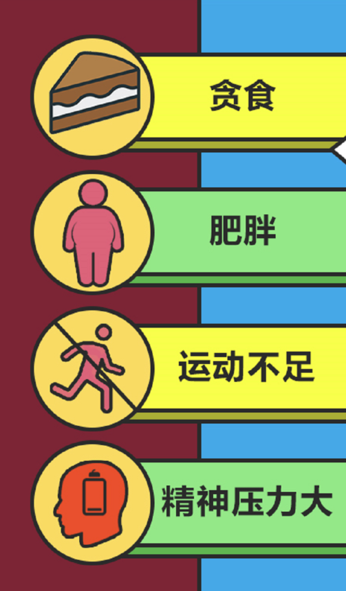 貪食、肥胖、運(yùn)動(dòng)不足、精神壓力大,