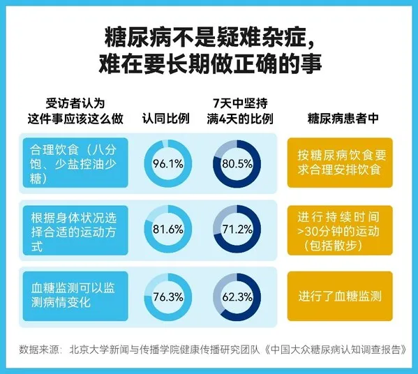 近日,由北京大學(xué)新聞與傳播學(xué)院健康傳播研究團(tuán)隊調(diào)研編制的《中國大眾糖尿病認(rèn)知調(diào)查報告》正式發(fā)布?!秷蟾妗凤@示,我國公眾對糖尿病的認(rèn)知水平仍處于較為基礎(chǔ)的階段,主要表現(xiàn)在“公眾對糖尿病危害的認(rèn)知明顯不足”、“糖尿病高危因素識別存在盲區(qū)”、“對糖尿病治療手段的認(rèn)知較為片面”等等,均表明在提升糖尿病的預(yù)防以及治療水平兩方面都面臨著挑戰(zhàn)。糖尿病已成重大健康威脅,公眾認(rèn)知仍顯不足根據(jù)國際糖尿病聯(lián)盟(IDF)最新發(fā)布的數(shù)據(jù)表明,截至2021年,中國20-79歲人群中糖尿病的患病率為10.6%,患病人數(shù)達(dá)到了1.41億,是世界上糖尿病患者最多的國家。不僅如此,從1990年到2021年,中國總體糖尿病的年齡標(biāo)準(zhǔn)化發(fā)病率、患病率和DALYs(傷殘調(diào)整生命年)都呈現(xiàn)上升趨勢,并且已經(jīng)和腎病一道躍升為中國第五大死亡原因。 更加令人擔(dān)憂的是,在已患有糖尿病的患者中,很可能有超過一半的人不知道自己已經(jīng)患病。中國醫(yī)科大學(xué)滕衛(wèi)平團(tuán)隊通過調(diào)查全國7.59萬名成年受試者發(fā)現(xiàn),糖尿病患者中,僅有43.3%的患者知道自己患有糖尿病,其余56.7%的患者不知道自己患病。這些數(shù)據(jù)表明,提高公眾對于糖尿病的認(rèn)知非常有必要。糖尿病認(rèn)知——認(rèn)知度與危險度呈現(xiàn)反比例血糖升高是糖尿病的表現(xiàn)形式之一,而糖尿病最為嚴(yán)重的危害則在于血糖長期處于較高水平所可能衍生出的各類并發(fā)癥,如心腦血管病變、視網(wǎng)膜病變、腎臟病變、神經(jīng)系統(tǒng)病變、足部病變等。根據(jù)《報告》的調(diào)查結(jié)果可以發(fā)現(xiàn),公眾除了對體形消瘦、腎臟病變和視力下降這三項糖尿病可能引發(fā)的危害,認(rèn)知率尚可,對于其他類型的,特別是那些死亡風(fēng)險較高的危害,反而認(rèn)知不足。例如,糖尿病患者發(fā)生心腦血管疾病的危險性較同年齡、性別的非糖尿病人群高出2-4倍,但只有43.0%的受訪者知曉糖尿病與血管疾病之間的關(guān)聯(lián)。由此可見,當(dāng)前公眾對糖尿病的危害并未形成充分的認(rèn)知。 另一個值得注意的現(xiàn)象是,我國的糖尿病易感群體相較其他群體對于糖尿病的認(rèn)知率反而更低?!秷蟾妗分嗅槍Α熬米腿狈w力勞動兩個人群是糖尿病易感群體”的調(diào)查顯示,學(xué)生群體和上班群體作為久坐和缺乏體力活動最為明顯的群體,他們對“久坐群體為易感群體”的認(rèn)知率分別為32.25%和40.43%,對“缺乏體力勞動群體為易感群體”的認(rèn)知率分別為47.74%和50.55%,4項數(shù)據(jù)均未達(dá)到及格線。作為“高風(fēng)險人群”,上班族和學(xué)生黨本身并未對自身可能會患有糖尿病具備足夠的認(rèn)知。《報告》指出,糖尿病易感人群的識別主要有兩方面意義:首先,對于個體而言,了解易感人群的特征,將有助于其判斷自身風(fēng)險水平,及時調(diào)整干預(yù);其次,從社會化干預(yù)角度來講,當(dāng)個體了解易感人群的特征,其就可以通過這些特征對身邊的親友家人進(jìn)行判斷,作為“重要他者”,推動身邊人的及早干預(yù)。而對于以糖尿病為代表的慢性病來說,另一大挑戰(zhàn)就是長期的管理治療。例如,治療依從性始終是胰島素治療的難以邁過的一道坎,頻繁的注射扎針,復(fù)雜的病程管理等,讓未進(jìn)行胰島素治療的患者望而卻步,正在進(jìn)行胰島素治療的患者身心俱疲。受訪者認(rèn)為,糖尿病的管理過程之復(fù)雜,涉及飲食、運動、藥物以及定期監(jiān)測等多個方面。這讓他們在執(zhí)行治療計劃時壓力倍增,嚴(yán)重影響了治療依從性。即使努力遵循醫(yī)生的建議,但在實際執(zhí)行中,正常的治療計劃仍會受到如工作、家庭、自身情緒等不確定因素的干擾。不做“糖人”,構(gòu)筑自我健康防線,從血糖監(jiān)測開始歸根到底,糖尿病的治療主要是將血糖穩(wěn)定在一個合適的區(qū)間內(nèi),對于患者來說,過高和過低都是不可取的,因此,需要日常監(jiān)測血糖,及時調(diào)整藥物和胰島素的劑量。另外,還需要監(jiān)測眼底、尿微量白蛋白、心電圖等指標(biāo),以便及時發(fā)現(xiàn)糖尿病的并發(fā)癥。 血糖監(jiān)測是糖尿病管理的“五駕馬車”之一,是糖尿病管理中的重要組成部分。通過血糖監(jiān)測,患者可以了解自己的血糖波動情況,及時發(fā)現(xiàn)低血糖或高血糖事件,預(yù)防并發(fā)癥的發(fā)生。此外,血糖監(jiān)測也是評價藥物治療效果、調(diào)整飲食和運動計劃的直接依據(jù)。血糖監(jiān)測的時間點包括三餐前、三餐后2小時、睡前、午夜及其他時間點的隨機(jī)血糖(尤其有低血糖癥狀時)。病情不同的患者可以根據(jù)自身情況靈活選擇血糖監(jiān)測的時間及頻率:血糖控制良好的患者可以每周測1天~2天空腹和餐后2小時的血糖;血糖控制不佳的患者最好能做到每周4天~7天進(jìn)行全天血糖監(jiān)測,每天4次~7次;低血糖風(fēng)險高的患者要重視午夜血糖、餐前血糖和有低血糖癥狀時的即時血糖。目前,市面上的便攜式血糖儀種類繁多,首選準(zhǔn)確度高的,其次就是操作便捷性最好是能連接手機(jī),符合ISO15197:2013(±15%)國際標(biāo)