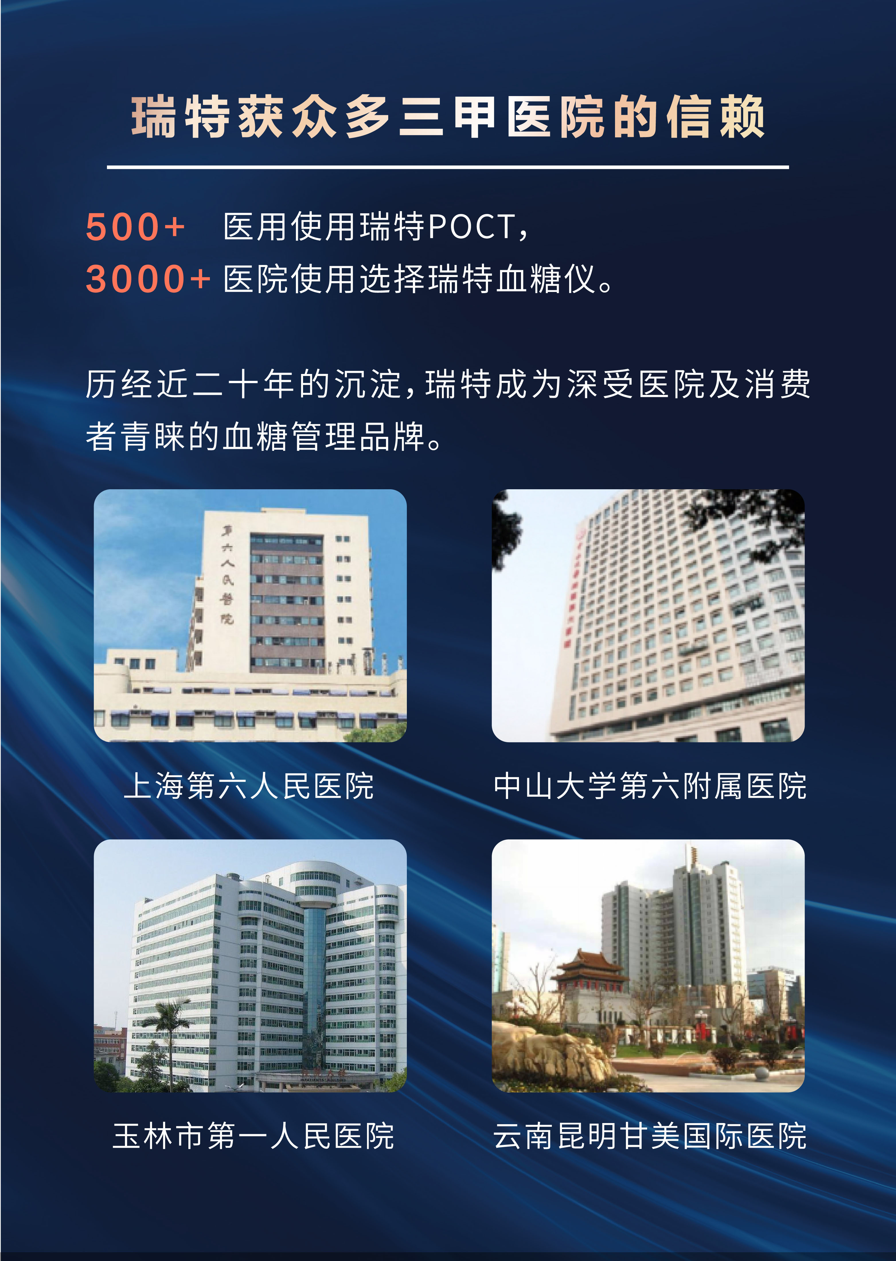 瑞特血糖儀取得中國、美國、歐盟等主要5大系統認證,并在全球超過80個國家和地區認證。正是基于卓爾不群的品質,全國目前已有超過500家醫院使用了瑞特“全方位智能血糖監測系統”,有超過3000家醫院使用了瑞特血糖儀。