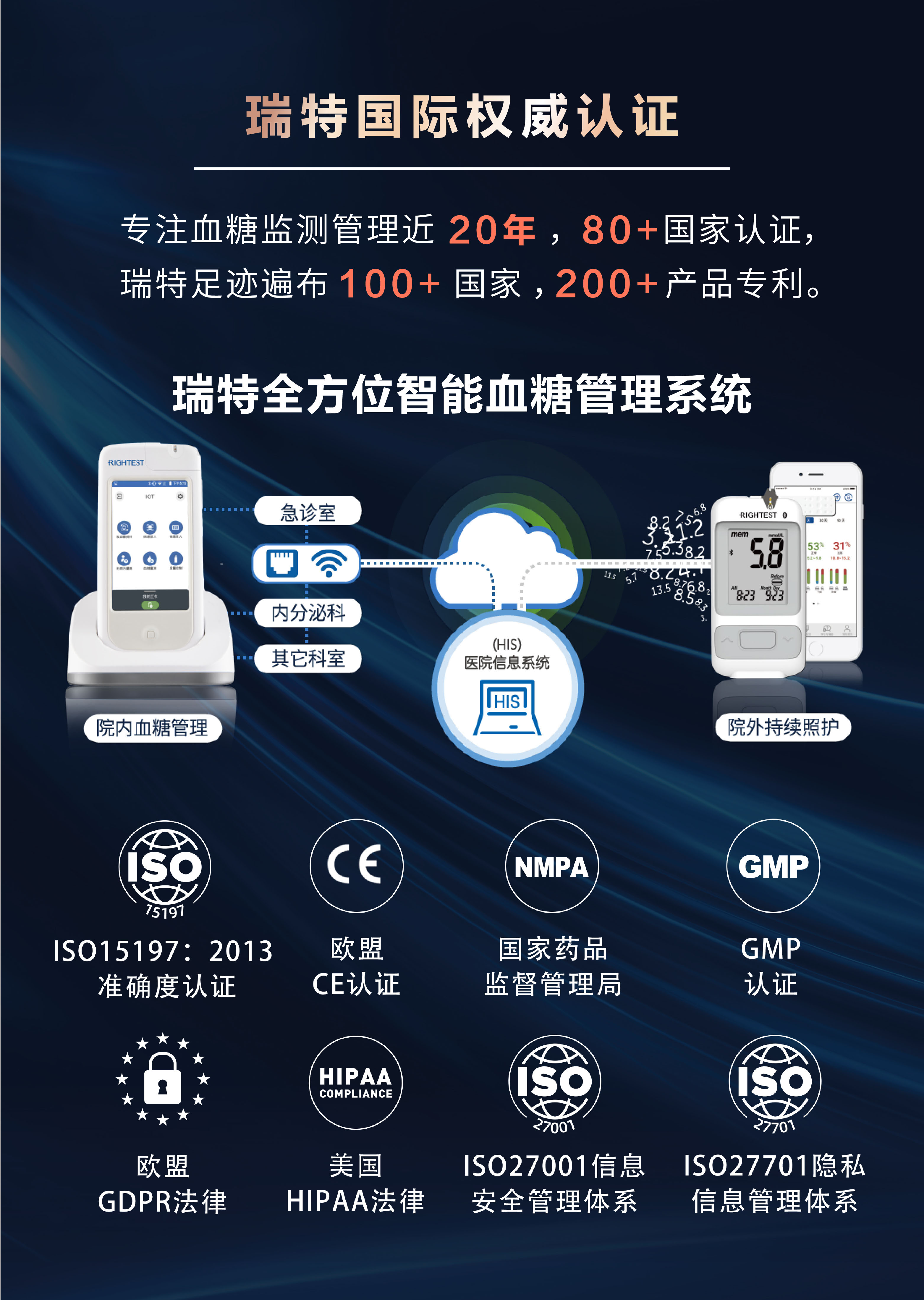 瑞特成功整合了先進的醫療、化學、電子與精密制造技術,獲得多項獨特的血糖檢測專利,采用黃金電極專利技術,確保每一次血糖測量數據的準確性。迄今為止,瑞特產品在全球已經取得超過80個國家的權威認證,產品銷售遍布全球100多個國家和地區,瑞特血糖管理系統成功入駐500多家醫院,瑞特血糖儀產品供貨國內3000多家醫院。