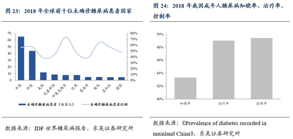 誠然,和我國與日俱增的糖尿病壓力相對的,是國民對于血糖監測意識的缺乏。據統計,2018年我國成年人對于糖尿病知曉率僅為43.3%,治療率僅為49.0%,控制率僅為49.4%。根據中國產業信息網調研,2019年我國糖尿病患者血糖儀滲透率僅在25%左右,與歐美國家90%的血糖儀滲透率相距甚遠。