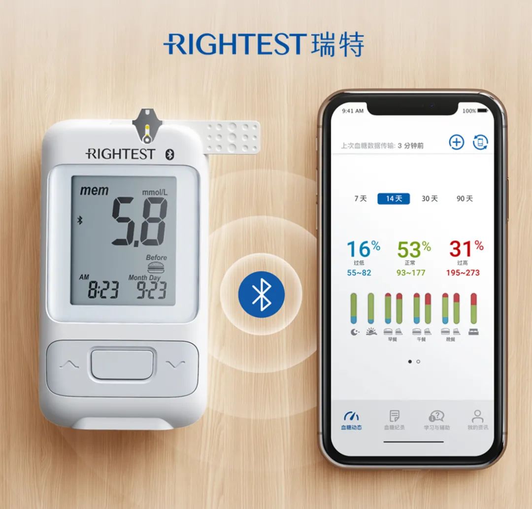 瑞特智能血糖儀采用藍牙無線快速傳輸,手機app實時同步血糖數據,搭載餐前/餐后智能測糖提醒功能,有效監控長短期血糖波動趨勢,家人也可以登錄瑞特健康APP查看TA的血糖數據,幫助控糖穩糖。