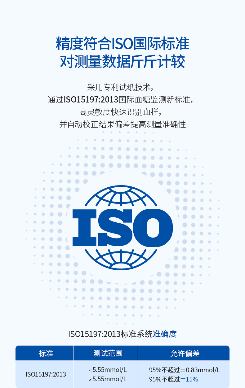 符合ISO 15197:2013規(guī)范,且血糖測試范圍為:0.6mmol/L~33.3mmol/L