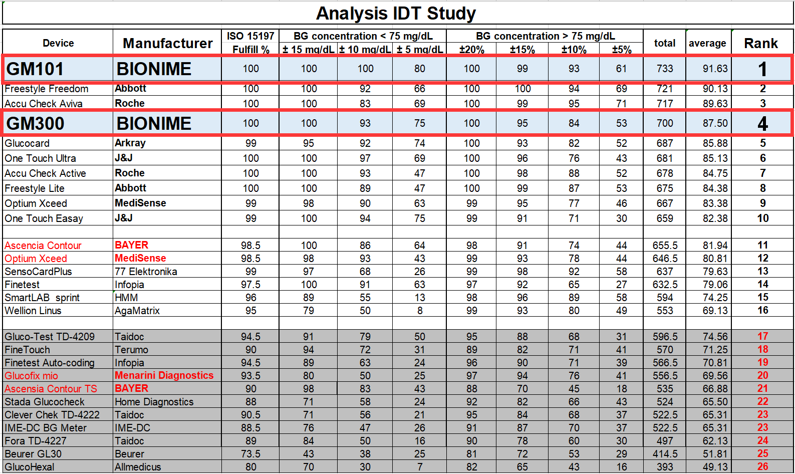 同時,德國IDT機構(gòu)依ISO15197規(guī)范,對27款血糖儀進行系統(tǒng)準確度測試BIONIME華廣瑞特血糖儀準確度排名NO.1.
