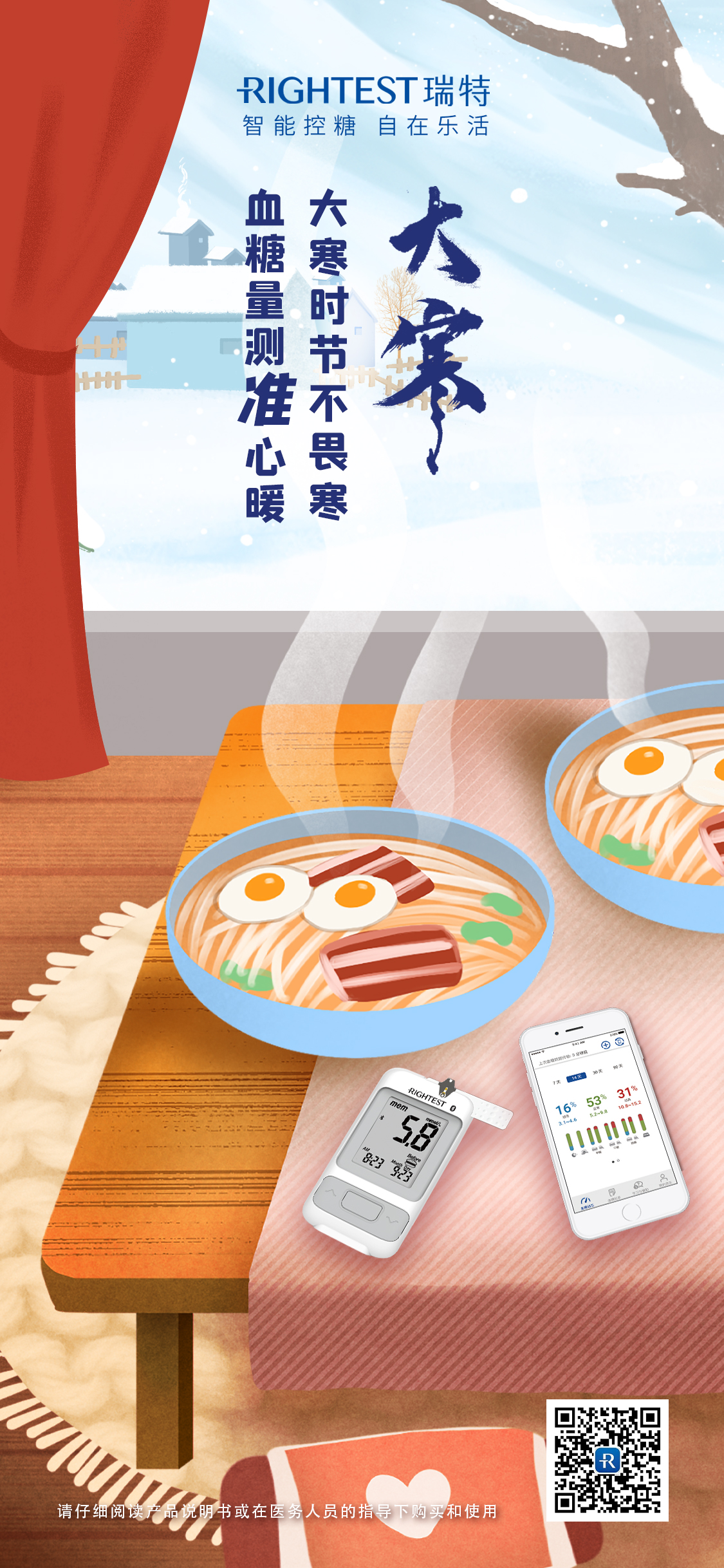 所謂“陰極之至,陽氣始生”,也是一年中寒暖交接的的時候,稍不注意細菌和病毒很容易侵害到我們的身體。大家要注意添衣保暖、適當的鍛煉,避免過喜或傷心的情緒,使身體氣血和順,降低血糖控制不當引發多種疾病發生的風險。